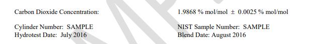 该 SRM 混合物已通过二氧化碳浓度认证。下面给出的认证值适用于已识别的气瓶和 NIST 样品编号。
